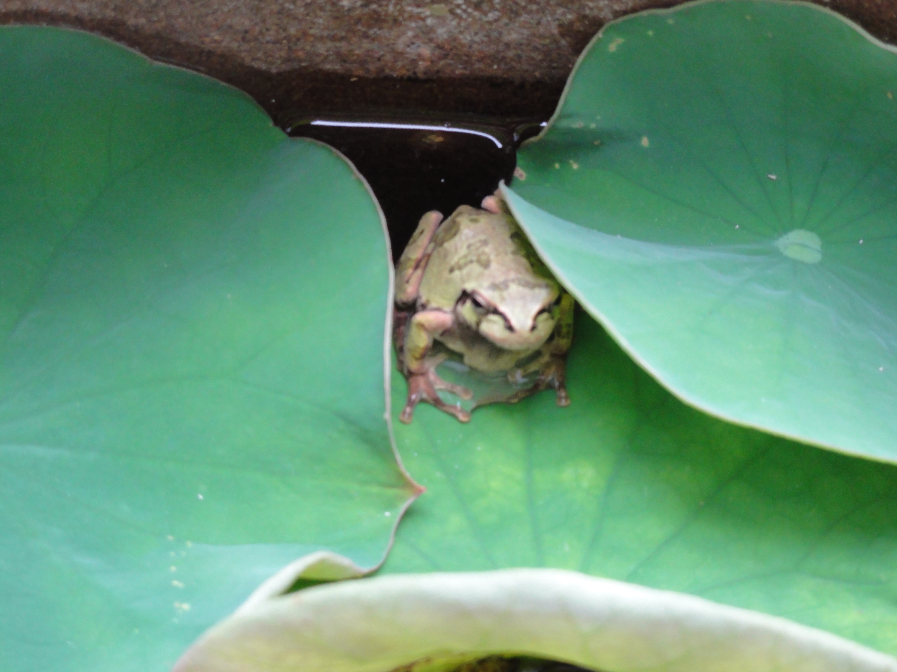 ある日、その花の下の葉に隠れるように、体長が5㎝にも満たない雨蛙が住みつき、その体の大きさには不釣り合いなほどの大きな声でしきりに鳴いていました。妻と苦笑しながら、新しいペットを飼ったような不思議な癒し感と和やかな感情を抱いたものでした。